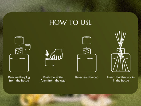2. Insert the reed sticks into the bottle. Increase or decrease the reed stick quantity to adjust fragrance.
