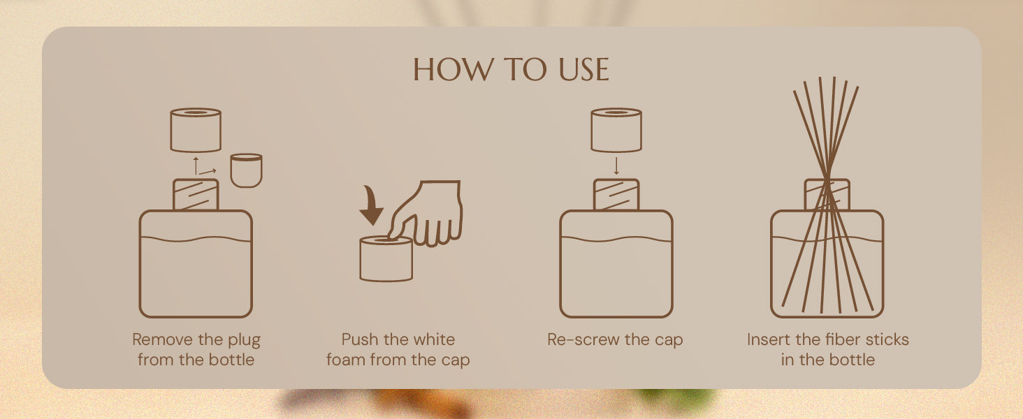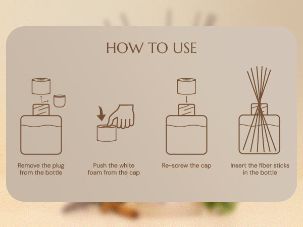 2. Insert the reed sticks into the bottle. Increase or decrease the reed stick quantity to adjust fragrance.