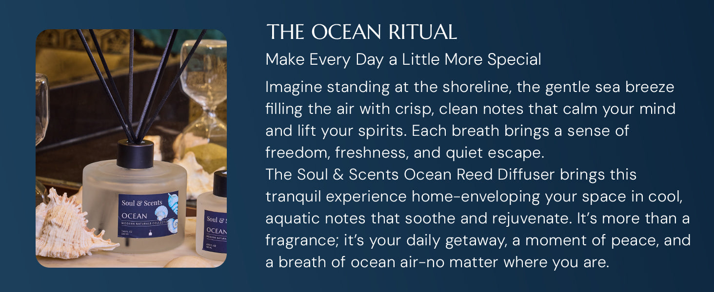 Ocean captures the feeling of standing at the shore—salt in the air, waves rolling in, sky stretching wide.