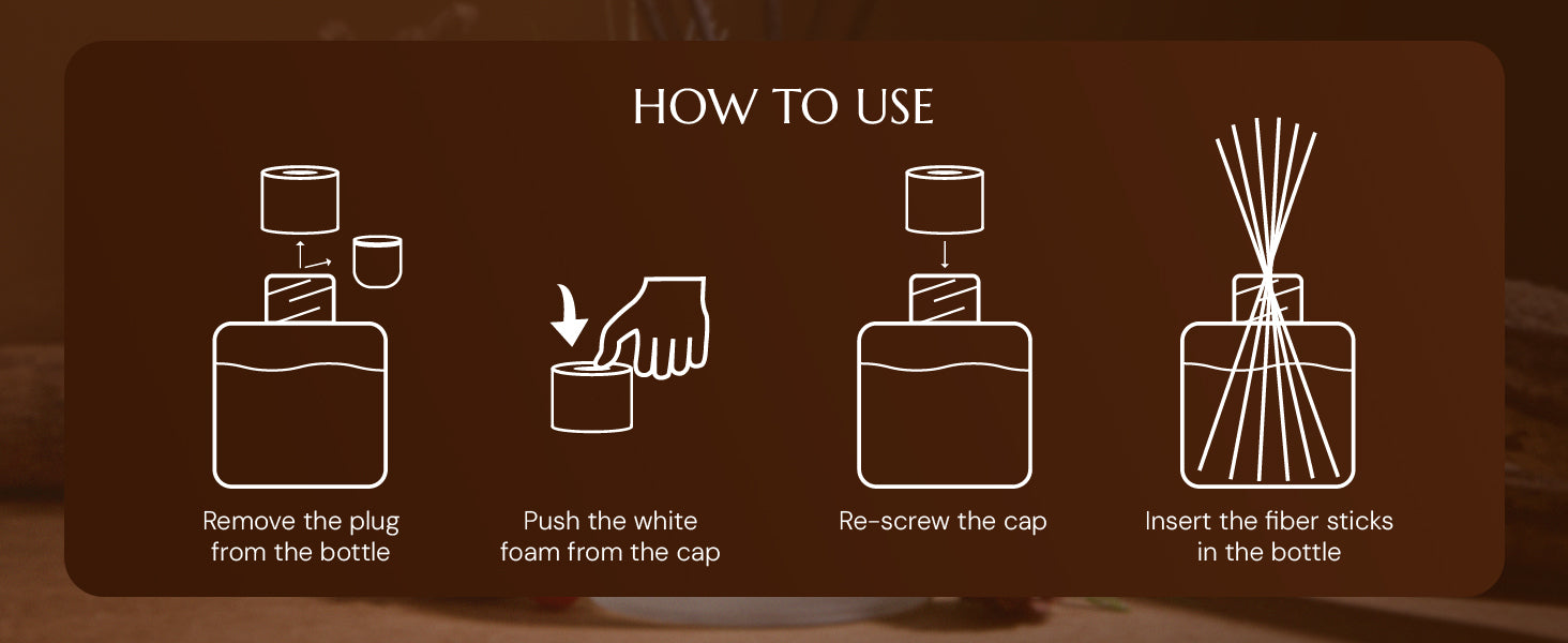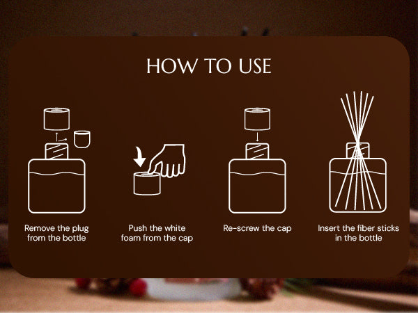 2. Insert the reed sticks into the bottle. Increase or decrease the reed stick quantity to adjust fragrance.