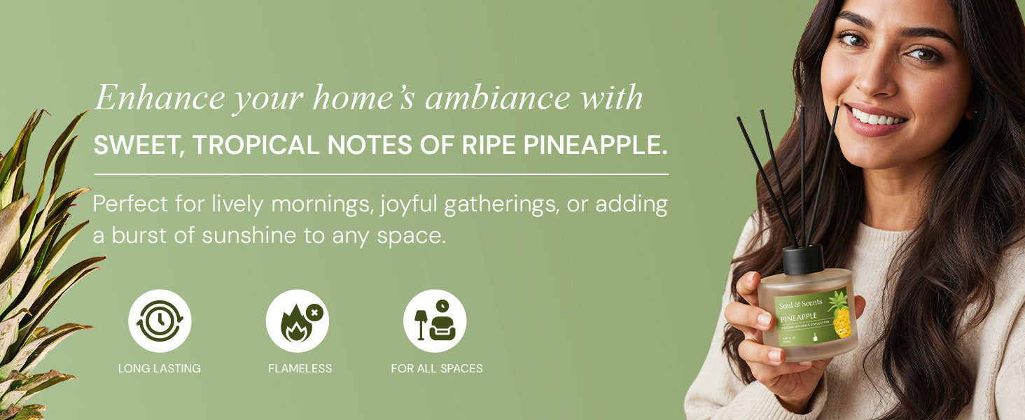 This diffuser brightens your space like a smile. Bursting with ripe pineapple and softened with gentle florals, it’s juicy but not overwhelming.