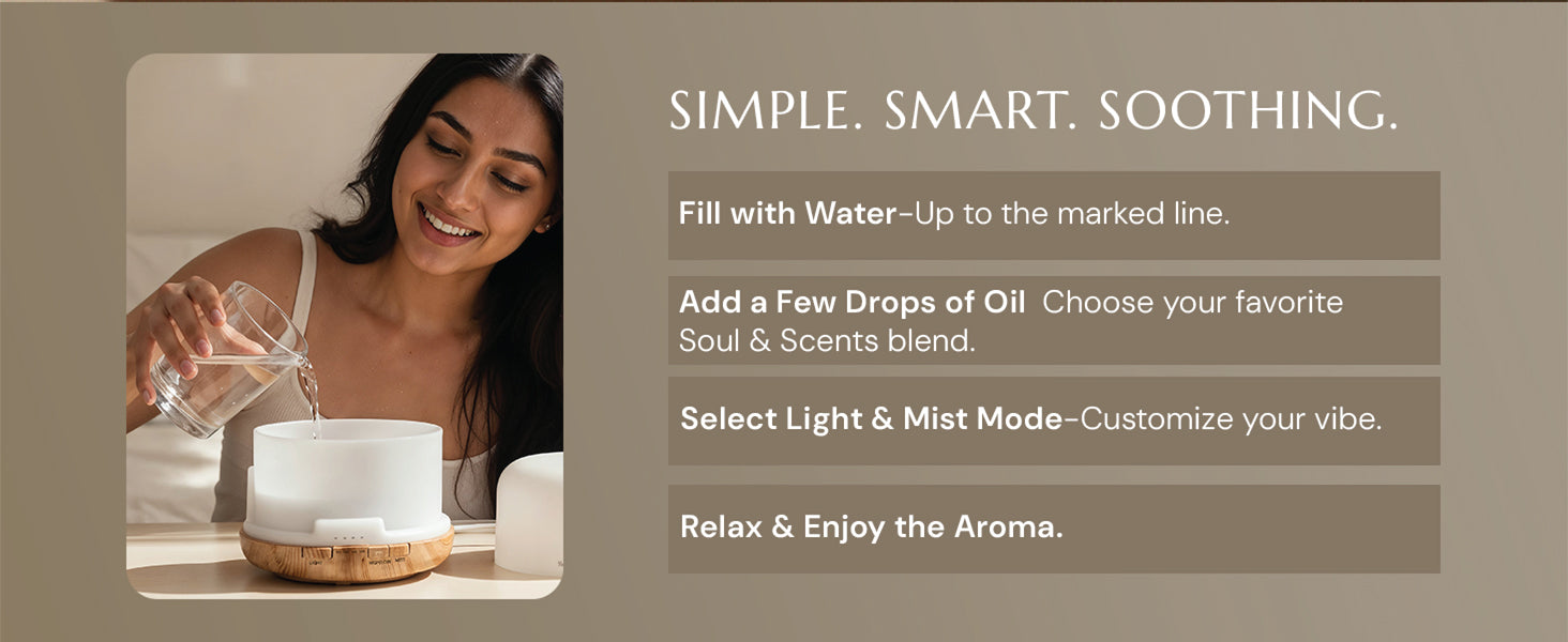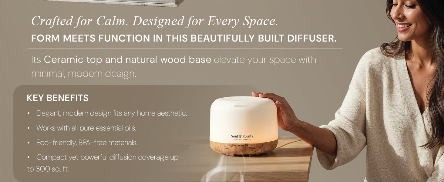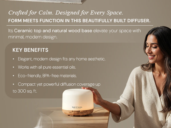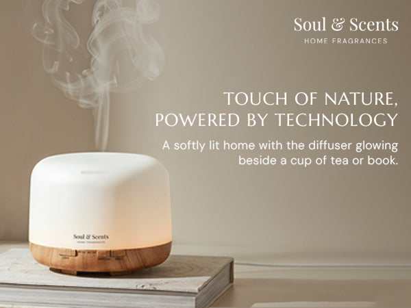 The Soul and Scents Premium Essential Oil Diffuser combines aromatherapy, humidification, and vaporizing in one elegant device, creating a soothing and refreshing atmosphere for your home or office. With its large 500ml capacity, it provides hours of continuous mist to keep your space fragrant and comfortable, while the built-in timer and auto shut-off feature ensure safe and hassle-free use. Simply add a few drops of your favorite essential oils to relieve stress, improve sleep, and uplift your mood, making it the perfect companion for relaxation, work, meditation, or daily wellness.